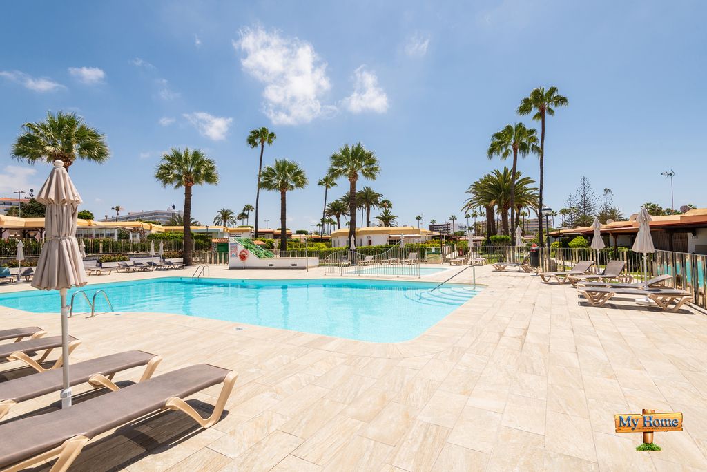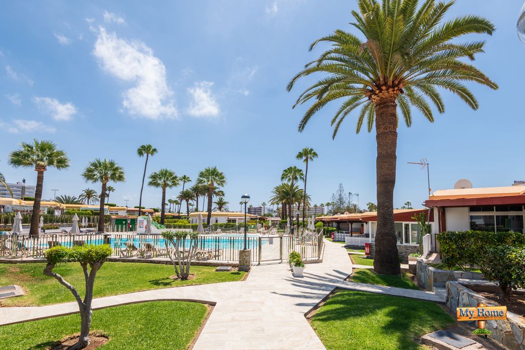 Increíble parcela de 110,00m2 en el corazón de Playa del Inglés. Bungalow adosado con amplio jardín y terraza. Complejo privado y residencial rodeado de frondosos jardines.
