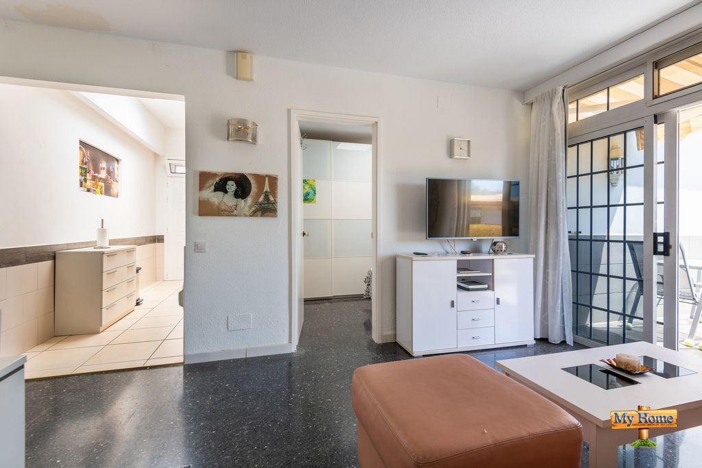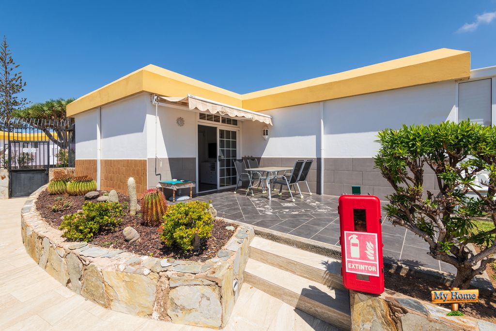 El bungalow consta de una bonita terraza con luz solar todo el día, un amplio salón con cocina americana y dos grandes dormitorios con ventanas hacia los jardines privados de la propiedad, todo con luz solar directa. Excelente oportunidad para vivir en el sur de Gran Canaria o una lucrativa oportunidad como inversión para alquilar como vivienda vacacional, ya que se encuentra en un complejo libre de cualquier explotación turística.